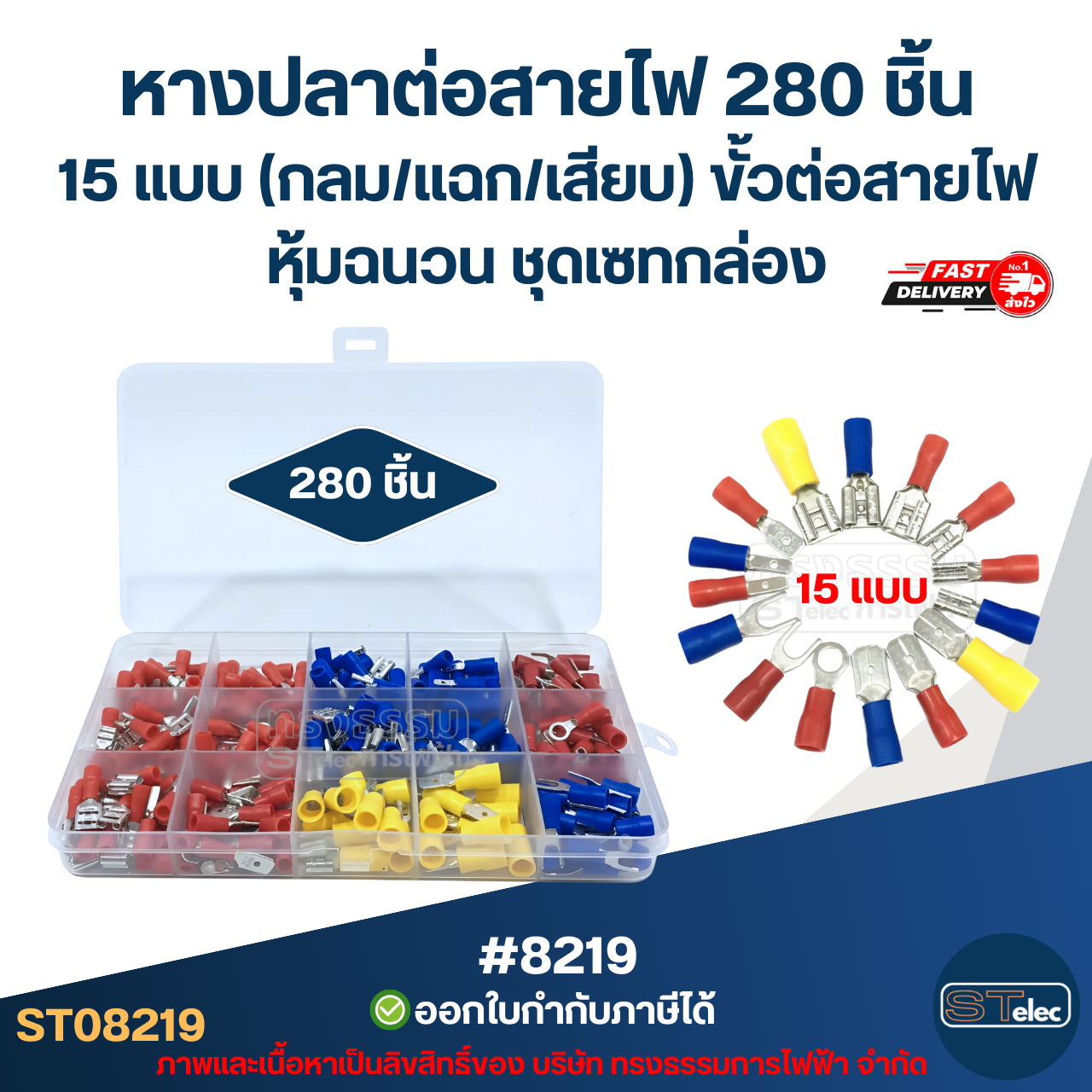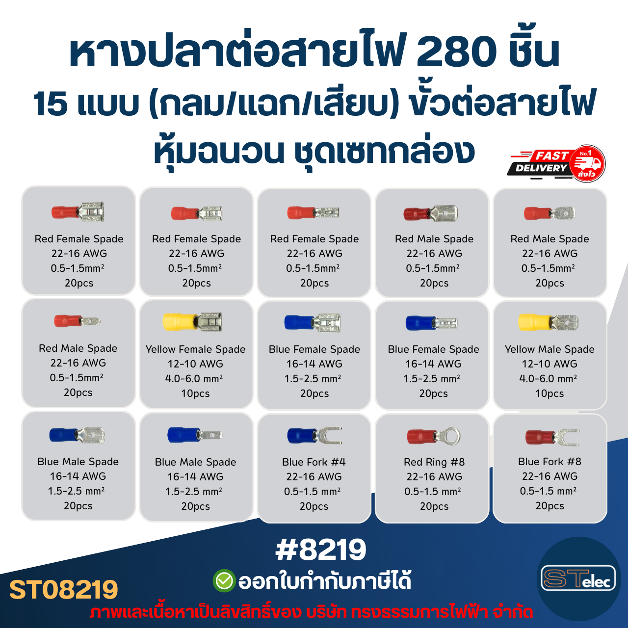 หางปลาต่อสายไฟ 280 ชิ้น 15 แบบ [#8219] (กลม/แฉก/เสียบ) ขั้วต่อสายไฟหุ้มฉนวน ชุดเซทกล่อง คุณสมบัติ : - Red Female Spade 22-16 AWG 0.5-1.5 mm² 20pcs - Red Female Spade 22-16 AWG 0.5-1.5 mm² 20pcs - Red Female Spade 22-16 AWG 0.5-1.5 mm² 20pcs - Red Male Spade 22-16 AWG 0.5-1.5 mm² 20pcs - Red Male Spade 22-16 AWG 0.5-1.5 mm² 20pcs - Red Male Spade 22-16 AWG 0.5-1.5 mm² 20pcs - Yellow Female Spade 12-10 AWG 4.0-6.0 mm² 10pcs - Blue Female Spade 16-14 AWG 1.5-2.5 mm² 20pcs - Blue Female Spade 16-14 AWG 1.5-2.5 mm² 20pcs - Yellow Male Spade 12-10 AWG 4.0-6.0 mm² 10pcs - Blue Male Spade 16-14 AWG 1.5-2.5 mm² 20pcs - Blue Male Spade 16-14 AWG 1.5-2.5 mm² 20pcs - Blue Fork #4 22-16 AWG 0.5-1.5 mm² 20pcs - Red Ring #8 22-16 AWG 0.5-1.5 mm² 20pcs - Blue Fork #8 22-16 AWG 0.5-1.5 mm² 20pcs