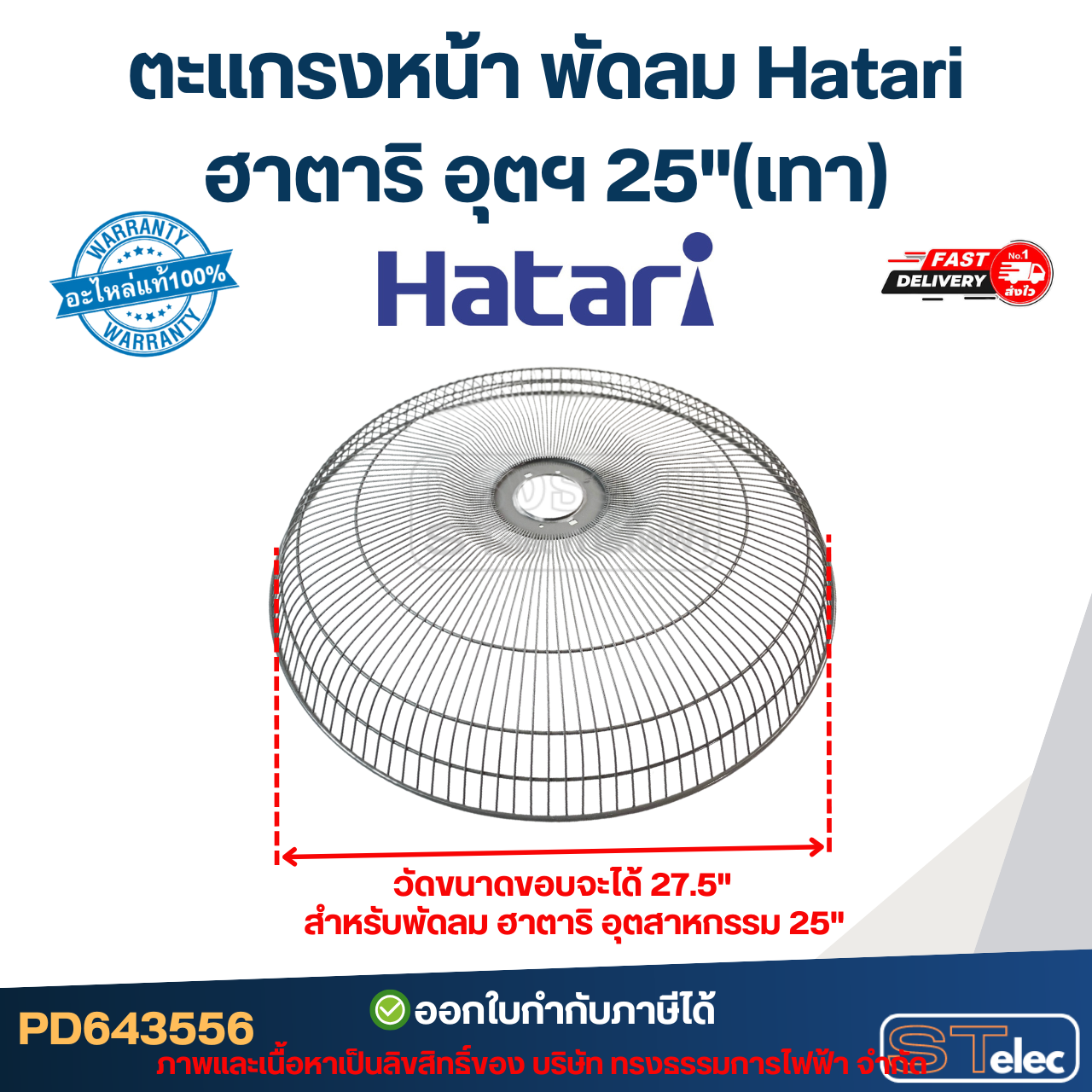 ตะแกรงส่วนด้านหน้า สำหรับพัดลม ฮาตาริ Hatari ขนาด25นิ้ว ตัวใหม่ของแท้ จะแตกต่างจากรุ่นเดิม ตรงที่จำนวนซี่ตะแกรงจะถี่กว่าเดิม ซึ่งผ่านมาตรฐาน มอก. เนื่องจากทำให้เด็กไม่สามารถแหย่นิ้วลอดรูตะแกรงได้ จึงทำให้ปลอดภัยมากยิ่งขึ้นสำหรับผู้ใช้งานค่ะ สินค้า: ตะแกรงส่วนหน้าของพัดลม ฮาตาริ Hatari ขนาด 25"(ขนาดของใบพัดลม) ขนาดใบพัดลม: 25นิ้ว สำหรับ: ยี่ห้อ Hatari ทุกรุ่น ขนาด 25นิ้ว เช่นรุ่น IQ25M1 ขนาดเส้นผ่าศูนย์กลางตะแกรง(วัดขอบถึงขอบ) = 27.5นิ้ว อะไหล่: แท้(Hatari) หมายเหตุ: ตะแกรงจะไม่มีโลโก้ฝาปิดตรงกลางติดมาด้วยนะคะ(ตามรูป) Note: ตะแกรงพัดลมทุกขนาด เช่น สำหรับพัดลมขนาด 25" ตัวตะแกรงถ้าวัดเส้นผ่าศูนย์กลาง ขนาดจะต้องใหญ่กว่า25" นะคะ(ประมาณ27.5") ตัวตะแกรงจะต้องกว้างกว่าใบพัดลมค่ะ เพราะฉะนั้นให้ลูกค้าดูจากขนาดของพัดลมเป็นหลัก ไม่ใช่วัดจากขนาดของขอบตะแกรงอาจจะทำให้สั่งผิดได้นะคะ. ✅ออกใบกำกับภาษีได้✅